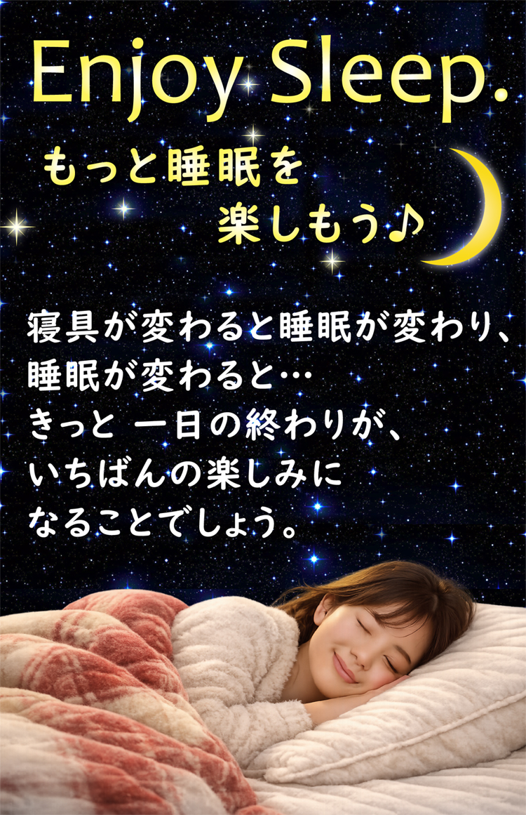 人生の3分の1は睡眠です。言葉を換えれば、私たちは人生の3分の1を布団の中で過ごします。もっとお布団が快適なら、もっと寝具が自分に合っていたら、きっと一日の終わりが、いちばんの楽しみになることでしょう。ササキは、そのためのお手伝いがしたいと、本気で願っています。